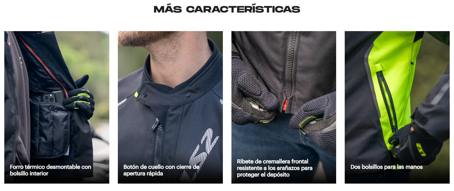 Pensada para el uso diario y los trayectos urbanos, incluye detalles que marcan la diferencia: cuello de neopreno, cierres de contacto, múltiples bolsillos internos y externos, bandas reflectantes para conducción nocturna y ajustes en mangas y dobladillo para un calce perfecto.